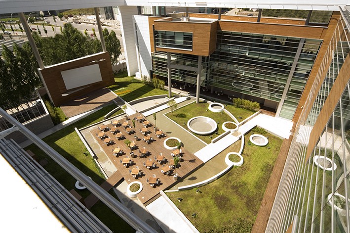 Kurgunun temel unsurlarından birisi olan ve dış mekanlardaki zenginliğin iç mekanlarda da devamlılığını sağlayan “iç bahçe”, yeşil unsurlarla desteklenerek toplantı salonu fuayesi, sergi holü, kafe-restoran bağlantı köprüleri ve galeri boşluklarından oluşan bir bütün olarak tasarlanmış. Bahçe ile kapalı alanlar arasında bir geçiş alanı tanımlayan “iç bahçe”, çalışma mekanları ile sosyo-kültürel mekanlar arası görsel ve eylemsel kademelenmeyi sağlarken aynı zamanda da, verimi arttırıp çağdaş bir çalışma ortamının elde edilmesine katkı sağlamış.