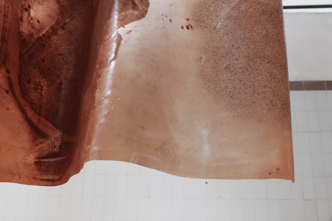 Tekstiller Natural Material Studio tarafından geliştirilen doğal yumuşatıcı ve pigmentlerden oluşan, evde kompostlanabilir, protein bazlı bir biyoplastik olan Procel ile birbirine bağlanan ezilmiş tuğlaların bir kombinasyonundan yapılmış. Belirgin bir şekilde kırmızımsı bir renk tonuna sahip olan tekstiller, Alcova'daki bir odada metal çubuklar üzerinde çatıdan sarkan büyük, kabaca kesilmiş plakalara bölünerek tavan pencereleriyle aydınlatılan dramatik bir enstalasyon oluşturdu.