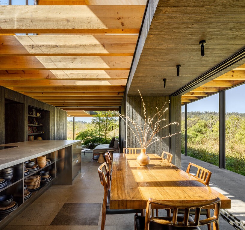 Robert Hutchison Architecture + JSa imzalı net sıfır inziva yeri, çevredeki doğa ve yerel iklim ile uyum içinde çalışacak şekilde tasarlanmış. Volkan Toluca Dağı'na doğru manzara sağlamak için stratejik olarak konumlandırılan proje, bir ev, müstakil bir hamam ve bir stüdyoyu birleştiriyor.