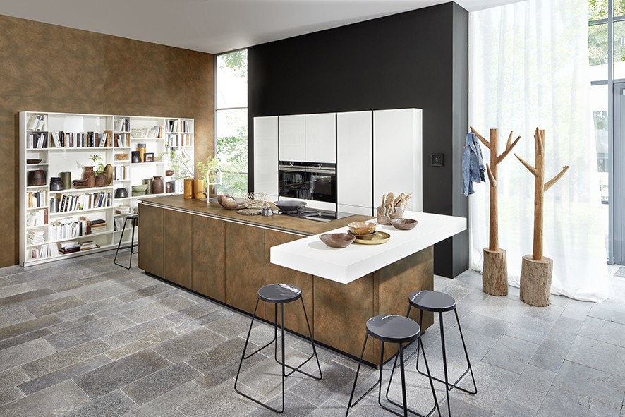 Nolte Küchen 2018 yeniliklerinden Metal kapak Ferro bakır rengi ve Parlak Lake kapak Nova Lack beyaz ile tasarlanan kombinasyonda ada mutfakta yer alan desk ile yemek yaparken aynı zamanda misafirlerinizi de ağırlayabileceğiniz alanlar yaratılmıştır. Bununla birlikte duvar modülde yer alan kitaplık kullanımıyla da sadece mutfak değil yaşayan alanlar tasarlıyoruz ve sevdiklerinizle adeta evinizin salonundaymışsınız hissini yaşatıyoruz.