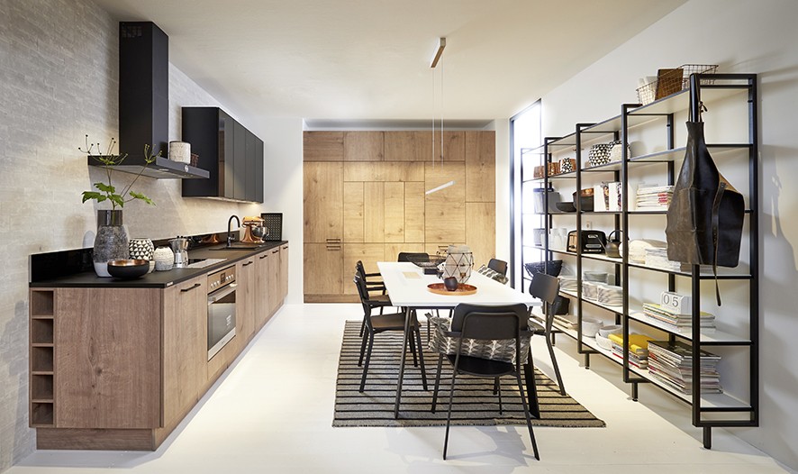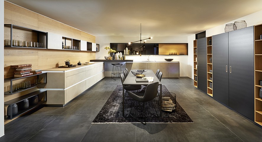 Açık raf sistemleri, metal, ahşap ve betonun bir arada kullanılmasıyla doğadan esinlenerek yaratılan ortam, orta alanda kullanılan büyük bir masa ve sandalyeler ile büyük aile yemeklerinizi hem samimi bir ortamda gerçekleştirmiş olma imkanı vermekte hem de sadece mutfak değil yaşam alanı sunmaktadır.