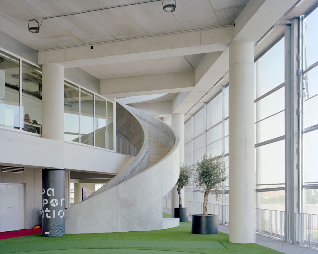 Sürdürülebilir mimari UCPA Sport Station Bordeaux'nun tasarımında NP2F, ölçülü bir malzeme ve renk paleti ile çalışarak, bir dizi spor aktivitesi için destekleyici bir platform görevi gören basit, düşük karbonlu beton bir yapı olan "kasıtlı olarak sade" bir bina oluşturdu. Açık merdivenler, sahanlıklar ve yürüyüş yolları bina çevresinde hareketi teşvik ediyor.