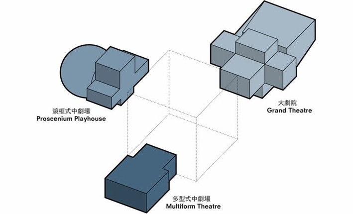 800 kişilik kapasiteye sahip olan Proscenium Playhouse, dıştan büyük bir küre olarak ifade edilirken, sırasıyla 1.500 ve 800 oturma kapasiteli diğer iki tiyatro ise periferik küpler olarak temsil ediliyor. Tüm sahne düzenlemeleri merkezi küp içinde bir araya getiriliyor. Bu tiyatrolar bağımsız olarak veya bir arada kullanılabiliyor, bu şekilde daha fazla esnekliğe olanak tanınıyor ve deneysel performans olanakları genişliyor. Bu gösteri sanatları merkezinin esnek yapısı, aslında Tayvan bakımından sanat için oldukça güçlü bir ibaredir. Benzer şekilde OMA'nin Pekin, Çin'deki CCTV binasında bir “kamu döngüsü” yaratarak bina boyunca sirkülasyonu kanalize etmesi TPAC'ı çalıştıran alanları açığa çıkarıyor. Alanlar tipik olarak halktan gizlidir, ancak performansların kendileri kadar açıklayıcıdır.