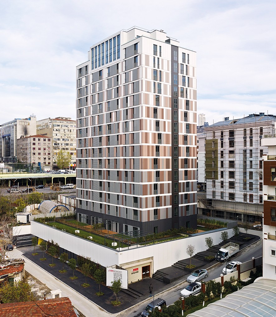 Yine aynı yatırımcı için Bomonti'de tasarladığımız ikinci konut projemiz Bomonti Modern Palas oldu. Bu projenin tasarımında, çevresel verileri önemle dikkate alırken, müşteri tarafından belirlenen kriterler doğrultusunda bir ve iki yatak odalı daire tipleri oluşturduk. Tasarımda yüksek verimlilik oranı ve sürdürülebilirlik yaklaşımı ortaya koyduk. Apartman bloğunun yönelimi kuzey-güney ekseninde konumlandırılarak, tüm dairelerin göreceli olarak eşit şekilde günışığı alacak şekilde doğu ve batıya yönelmesi sağlandı. Cepheye konumlandırılan güneş kırıcılarla, oluşan ısı geri kazanımları azaltılmaya çalışıldı. Dış cephede yer alan cam takviyeli beton paneller uygun maliyetli ve uzun ömürlü çözümler sağlarken, aynı zamanda yüksek ısı izolasyon değerleri sundu.