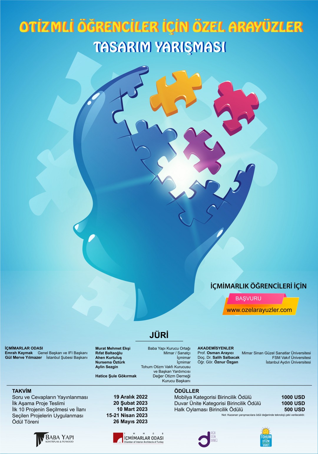 BABA Yapı sponsorluğunda, İç Mimarlar Odası, Tohum Otizm Vakfı ve Değer Otizm Derneği iş birliğinde “Otizmli Öğrenciler İçin Özel Arayüzler” sloganı ile bu sene ilki gerçekleştirilecek mobilya ve işlevsel yüzey tasarımı yarışmasının teması otizm bilinci ve özel gereksinimli bireylerin eğitim-sosyalleşme mekanlarına yönelik özgün tasarımlar olarak belirlendi. İlk aşama proje teslim 20 Şubat 2023 tarihine kadar devam edecek olup jürileri ve ödülleri, yarışmanın şartnamesi www.ozelarayuzler.com web sayfası adresinden indirilebilir. Plywood (Kontrplak) malzeme ile mobilya ve işlevsel yüzey tasarımı yarışması tüm Türkiye ve Kuzey Kıbrıs Türk Cumhuriyeti’nde iç mimarlık lisans bölümünde okuyan tüm iç mimari öğrencilerine açıktır.