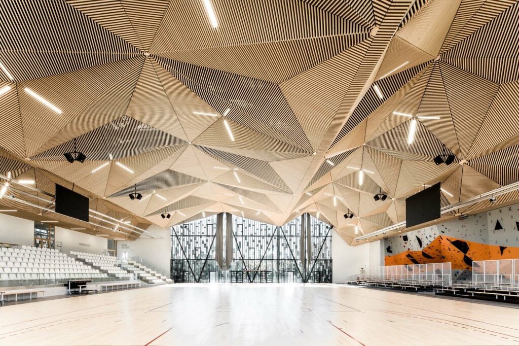 İç mimari, dış zarfı daha yerel bir kayıtta yansıtıyor. Buharlı bir beyazla tozlanmış gibi görünen akışkan boşluklardan cömert bir ışık yayarak berraklık temasını alır. Ahşap, bu huzurlu genel atmosferi yapılandırır ve fiili olarak, biyofilik etkisinden kaynaklanan bir esenlik duygusu ekler. Sofistike bir geometriyi takip eden tamamen ahşap asma tonoz ile en çok yararlanan büyük spor salonudur. Şehre, mekana, sakinlerine ve kullanımlarına yönelik bu kurucu dikkatlerden mimari, bu eşsiz yapıyı ortaya çıkarmak için duyarlı bir yorumcu haline geliyor.