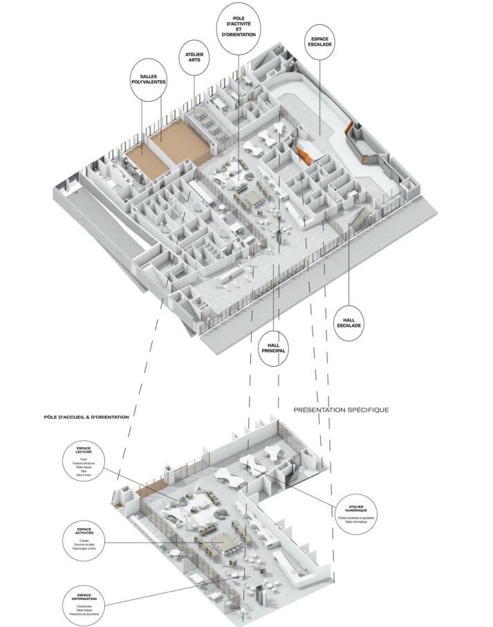 Bina, oluşumunu komşu rıhtımları dolduran tuğla depoların arketipsel morfolojisinden alıyor. Çift eğimli çatılarla mazgallı bu kentsel peyzaj, Le Havre'nin mirasıyla onu tanıdık bir refah vektörü yapma noktasına kadar inkar edilemez bir şekilde bağlantılıdır. Proje, gelişen ve barışçıl bir dönemin neredeyse melankolik sembolünü sürdürmek için profillerini yeniden üretiyor. Verimliliklerini spor alanlarına atfederek, yetenekli büyük hacimlerinin sade güzelliğine de saygı gösteriyorlar.