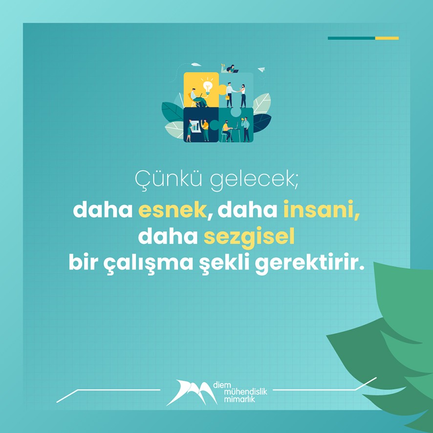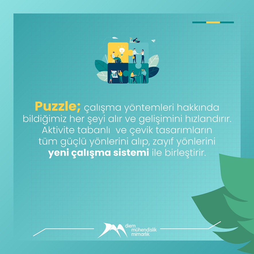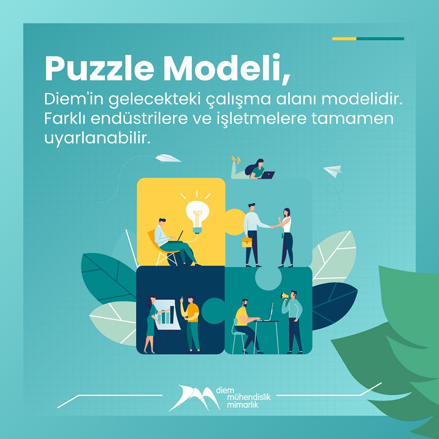 DİEM Mühendislik Mimarlık tarafından geliştirilen ve “puzzle” adı verilen model gelecekteki yeni çalışma ve yaşam alanlarını ön plana alıyor. Pandemiyle birlikte “Aktivite tabanlı çalışma sistematiğinden, deneyime dayalı çalışma sistemine dönüş” için geliştirilen model, uzaktan ve ofis tabanlı çalışmayı dengeleyecek nitelikleri bünyesinde barındıracak şekilde tasarlanırken, çalışanların belirli bir amaç için ofisi kullanmalarının da önünü açıyor.
