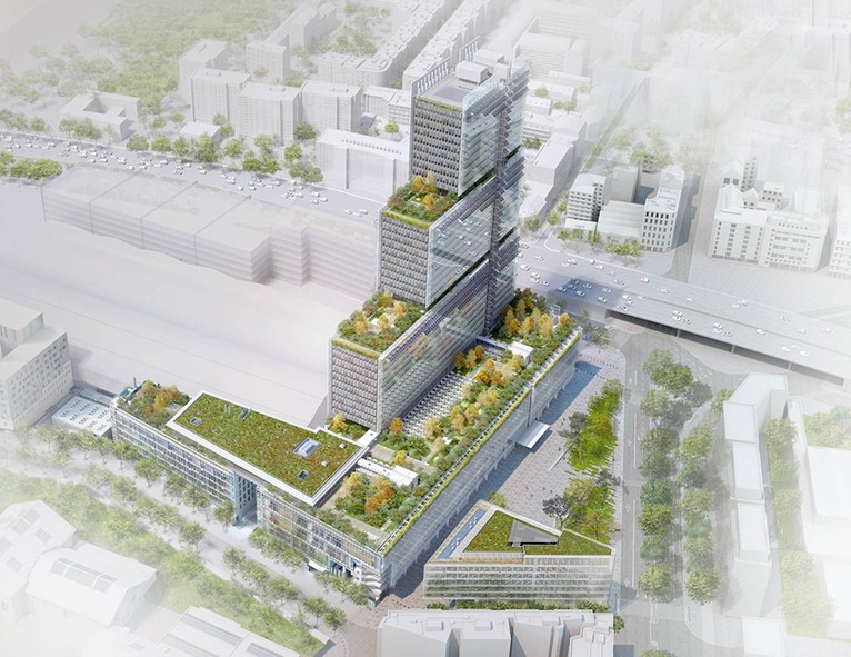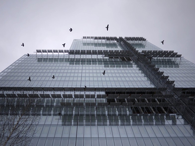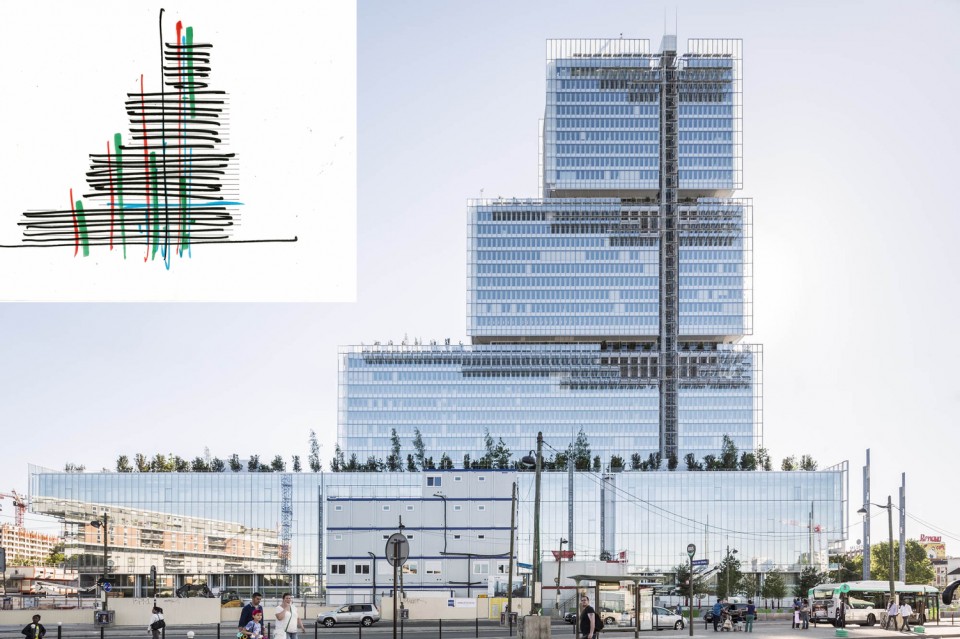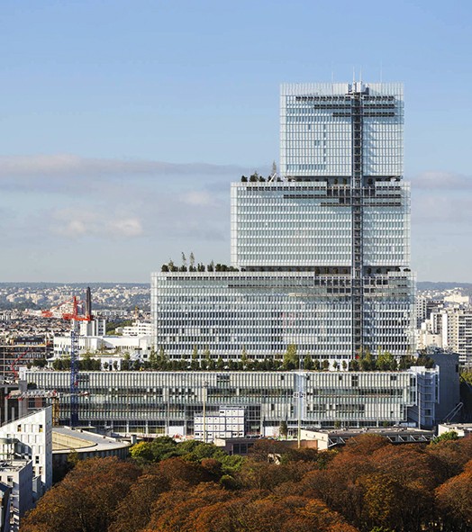 Bina, dört farklı hacmin üst üste giderek küçülen uzun ve kısa katmanlı kütlelerden oluşuyor. Bu katmanlı sistem binanın uzun ve keskin hatlarının yarattığı hissi yumuşatmakta. Ayrıca bu katmanlı yapının çatı terasları ağaçlandırılarak büyük bir yeşil çatı alanına imkan tanıyor. Yapının içinde ulaşımı sağlayan asansörler Paris’i gözlemleme şansı veren panoramik görüş açılarına da sahip.