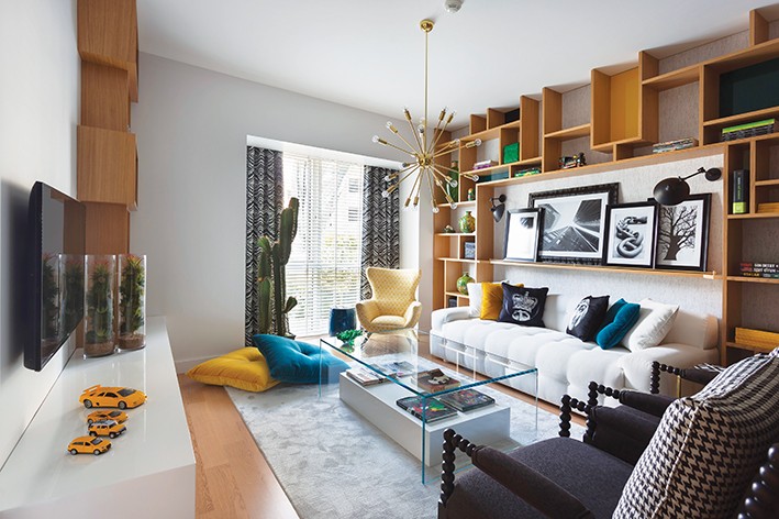 Tasarımın görselliğinden önce Helvacıoğlu bize örnek daireyi kişiselleştirme ihtiyacından bahsediyor. “Daireyi ilk gördüğümde detayları çözülmüş ve iyi giydirilmiş bir ev yerine, hikayesi olan bir ev yaratmak istedim. Yani bir sahibi olmalıydı... 30’lu yaşlarında inşaat mühendisi, sık seyahat eden, sosyal, mesleğinin getirdiği katılığı sanat ile neşelendiren, özellikle Pop-art seven, renklere düşkün, neşeli, dinamik ama konfora da bağımlı, evde vakit geçirmeyi keyif olarak gören biri olarak hayal ettim, ev sahibimizi. Ayrıca, kapıdan girildiğinde hissedilen, mutfak ile engellenmiş salon alanı yerine, sağ duvarda boydan boya devam eden, kanepeyi de saran, mutfağa da uzanan, sıcak meşeden açık bir kütüphane olmalıydı. Yer yer mekana espri katan yeşil, sarı, beyaz ve siyah ile neşelendirilmiş, sanat eserleri, koleksiyonlar, kitaplar ve günlük tüm ihtiyaçları sorgusuz kabul edebilen ve onlarla beslenen bir daire kafamda canlandırdım,” diye açıklıyor, iç mimar.