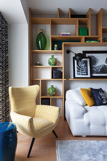 Kütüphanenin sardığı beyaz kanepenin üzerinde mekanın renklerinde yastıklar ve Fornasetti göz kırparken, hemen üzerinde siyah-beyaz mimari fotoğraf koleksiyonundan bir bölüm sergileniyor. Raflara serpiştirilmiş kişisel obje ve Vintage parçalar kütüphaneyi adeta bir sanatsal düzenleme gibi hissettiriyor. Cam sehpanın altından görünen ve kendi içinde bir duruş sergileyen Warhol ve sanat dergileri, yeşil Vintage cam objelerin sade vurgusuna eşlik ediyor. Pirinç küre aydınlatma ise tüm mekanın odak noktası olup mekanı bölen iki siyah koltuk, hem küreli hatları, hem de Pied e Poulé deseniyle salonun en kişilikli ögesi. Tüm pencereler beyaz jaluzinin geçirdiği gölgelerle giyinirken, yine siyah-beyaz desenler ile sınırlanıyor,” diye ekliyor.
