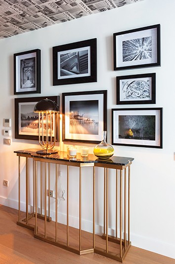 Girişten salona geçilen sol duvar, dresuar ve destek verdiği fotoğraf koleksiyonuyla evin sanatsal kurgusunu tamamlıyor. Pirinç üstü mermer tablalı dresuar Parete’den, abajur Haaz’dan, yeşil cam vazo ve mumlar Ikea’dan. Yabancı fotoğrafçıların özel seri siyah-beyaz fotoğrafları iç mimar tarafından tek tek farklı çerçeveletilip asılmışlar.
