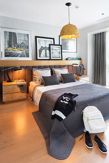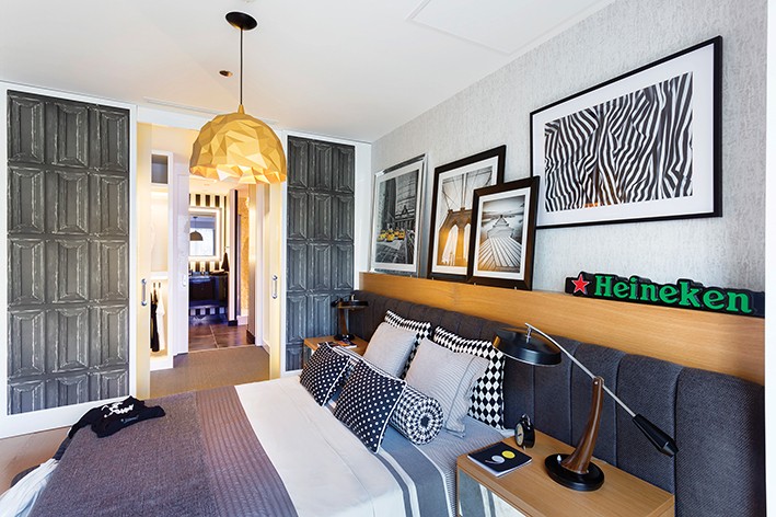 Hakan Helvacıoğlu tasarımı meşe kaplama özel üretim yatağın başında yabancı fotoğrafçı koleksiyonlarından toplanmış siyah – beyaz fotoğraflara yer verilmiş. Heineken yazısı aslında Vintage bir lamba olup yatağın iki başındaki lambadan Paris’ten, tavan sarkıt Diseno’dan alınmış. Yatak başı ve yastık kumaşları Tasarım’dan seçilirken, giysi odasının yatak odasına bakan yanları görsel kapı göbeği efektli duvar kağıdı ile panolanmış.