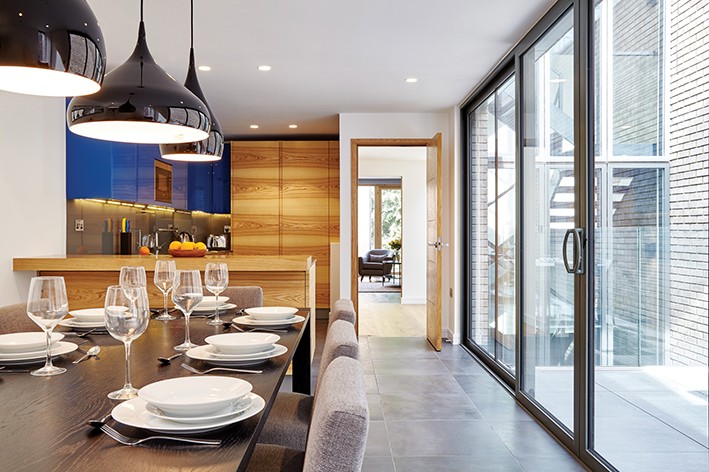 Açık mutfak ve yemek bölümünün şıklığını, odalar ile teras arasında kesintisizce devam eden siyah kuvars karolar ile pekiştirmiş.