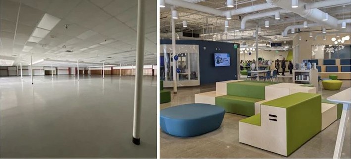 Eski bir TJ Maxx mağazası, canlı ve yeni bir halk kütüphanesine (Cincinnati, Ohio) dönüştürüldü. Geniş açık kat planları tekrar gözden geçirildi ve hem sessiz hem de gürültülü aktiviteler için farklı bölgeler tasarlandı.