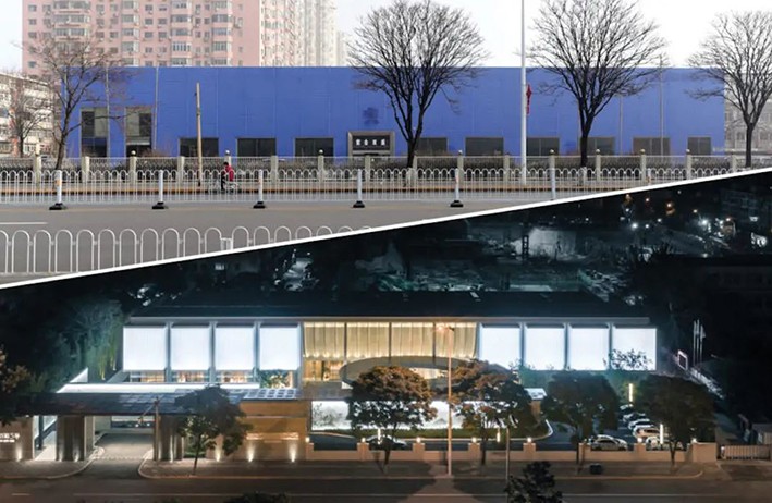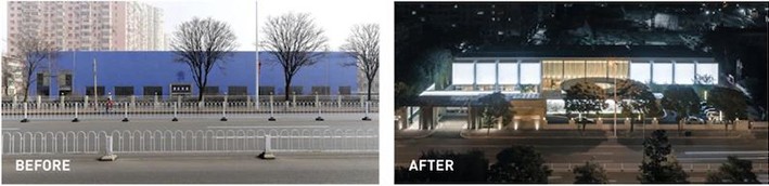 Bir araba galerisinin bir emlak sergi salonuna dönüştürülmesi. (Tianjin, Çin). Dış cephedeki artan açıklıklar, binaya gün ışığını arttırır ve gece varlığını güçlendirir.