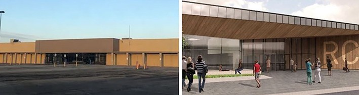 Terk Edilmiş Walmart'ın halk kütüphanesi; kıdemli merkez, anaokulu, spor salonu, su sporları, fitness, depo ve belediye (Rushville, Indiana) dahil olmak üzere hizmetler için bir topluluk merkezi haline dönüştürüldü. Cepheyi yükseltmek, eski bir binanın yeni bir hikaye anlatmasına yardımcı oldu.