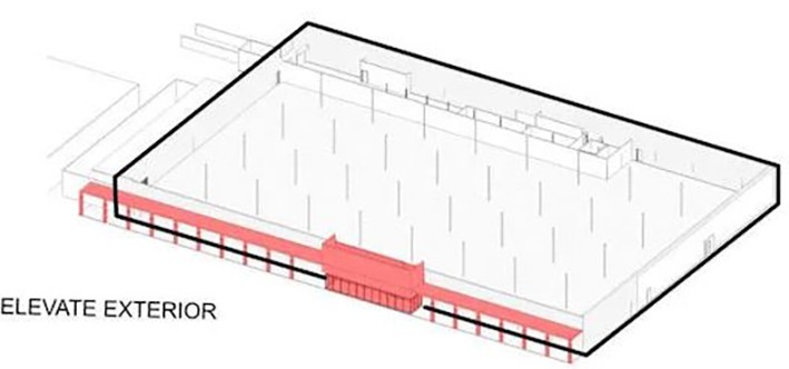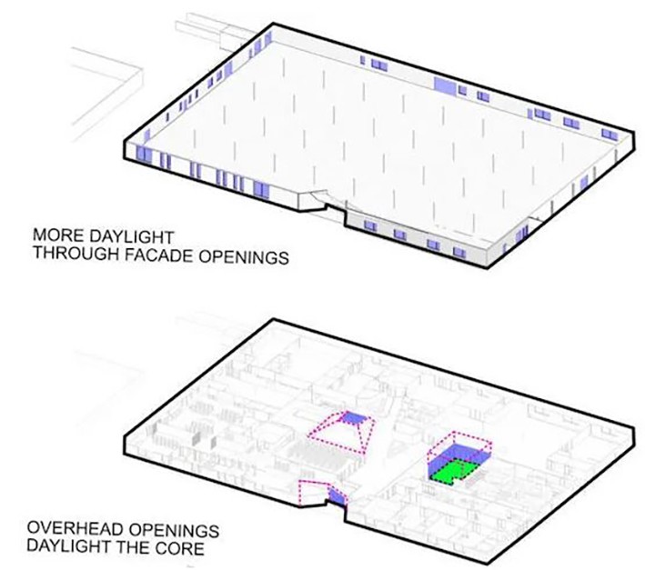Büyük kutu perakende binaları, genellikle cepheyi değiştirmek için zorluklar yaratabilen beton yük taşıyıcı duvarlardan inşa edilir. Bu binaların derin ayak izi, içeride olma deneyimini geliştirmek için gün ışığını gerekli kılıyor. Dış cephede artan açıklıklar, fazladan doğal ışık getirir ve binanın çevresi boyunca görünen manzaralar için fırsatlar sağlar. Yapısal elemanların daha büyük kısımlarını kaldırarak ve çatıya çatı pencereleri ekleyerek binanın kütlesini "oymak", ışığın binanın daha iç kısımlarına girmesini sağlayabilir. Bu durum da, insanların kendilerini rahat hissettikleri ve muhtemelen bir araya gelebilecekleri alanları harekete geçirebilir.