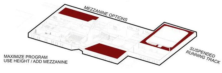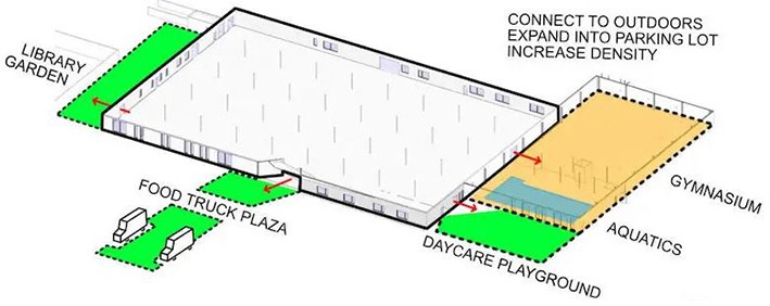 Büyük kutu perakende binaları, tek bir kiracıyı tek bir çatı altında barındırmak için inşa edilmiştir. Bununla birlikte, bu binaların kapladığı geniş alan, günümüz ihtiyaçlarına daha uygun olan birden fazla küçük alana bölünmek için olgunlaşmıştır. Perakendeden geçiş, bu alanların kolaylıkla ofislere, restoranlara, belediyelere ve topluma daha iyi hizmet eden diğer kullanımlara dönüştürülebileceği anlamına geliyor. Bir strateji, birden fazla alana cephe vermek için binanın içinde bir iç “ana cadde” veya “şehir meydanı” oluşturmaktır. Bir kiracı kombinasyonunu erişilebilir kılan bir iç mekân yaratmak, kullanıcıları daha uzun süre kalmaya teşvik eder- bunu bir "mikro alışveriş merkezi" olarak düşünün. Diğer bir strateji ise, dış bina kabuğunu, kiracı alanlarına birden fazla yeni girişe sahip olacak şekilde değiştirmektir. Aşağıdaki örnek bir şehir meydanı konseptini göstermektedir.