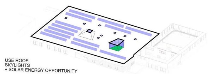 Büyük bir çatı, mevcut binada gömülü karbonun yeniden kullanımının ötesine geçen sürdürülebilir stratejileri uygulamak için bir fırsattır. Binanın kullanımı için elektrik üretmek üzere, çatıya bir dizi fotovoltaik hücre eklemek, binayı bir enerji üreticisi haline getirebilir. Eklenen çatı pencereleri ve avlular aracılığıyla, gün ışığını binaya filtreleyerek almak, içerideki alanın deneyimini geliştirebilir. Bunun yanında, çatı, tuvaletlerde veya ekim alanlarında yeniden kullanım için yağmur suyunu da tutabilir.