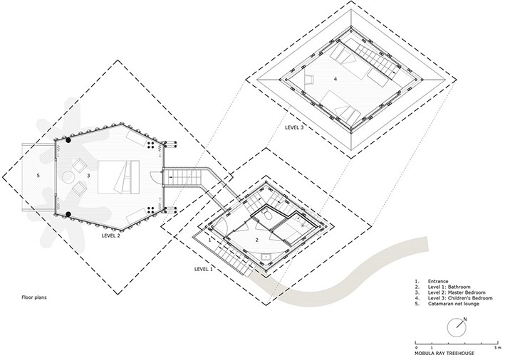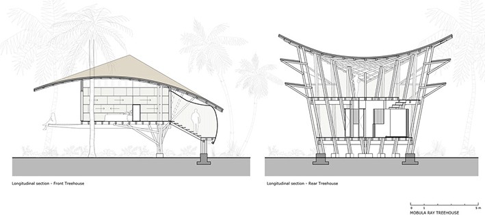 Tesisin en son uzantısı, mobula ışınlarının mülkün kıyısını geçen düzleştirilmiş, prizmatik gövdelerinden ilham alan 6 bambu ağaç evini içeriyor. Meksika kıyı şeridi boyunca dağılmış ağaç evler, sörf yapanları izleyebilecek şekilde hindistancevizi ağaçlarının üzerine tünemiştir. Her ağaç ev, ön tarafta bir ana yatak odası, arka tarafta ve alt katta banyo, üst katta ise ikinci bir yatak odası/salon içeren bir ek ağaç evden oluşmaktadır.