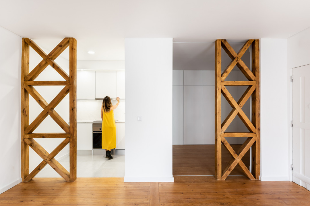 SER-ra mimarlık ofisi tarafından yenilenen bu dairede, “St. Andrew’s Cross” adı verilen çapraz ahşap destekler açık şekilde korunmuş. Orijinal iç plan büyük ölçüde korunurken, bu yapısal ögeler estetik bir unsur olarak mekâna dahil edilmiş.