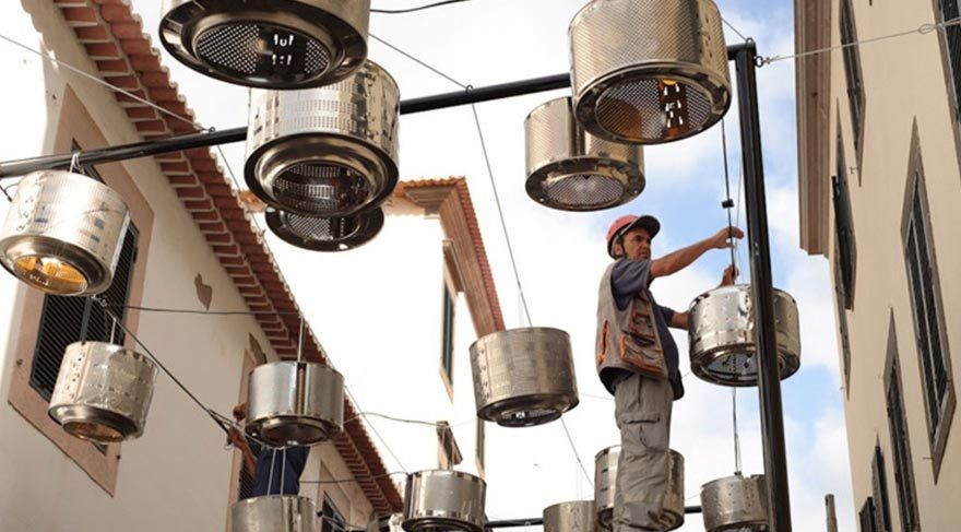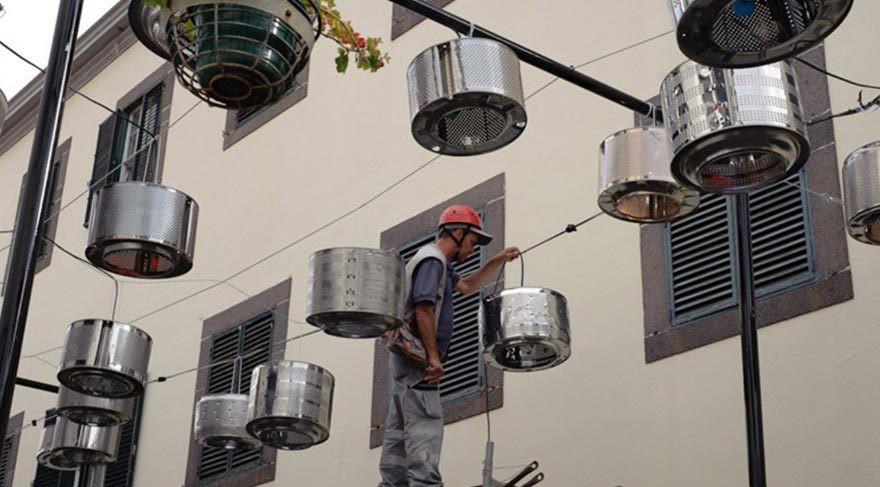 Tipik, dar Portekiz sokaklarından birinde kurulan platforma asılan kazanlar tasarımın ve geri dönüşümün gücünü birlikte sergiledi.