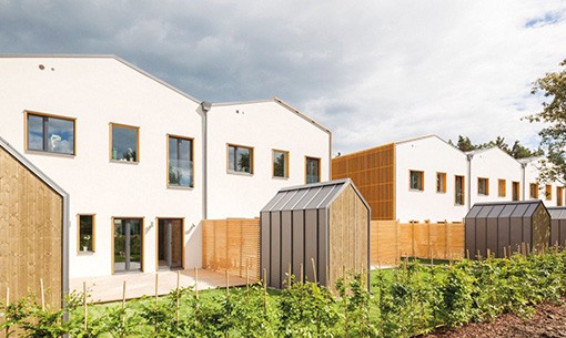 Pasif güneş prensiplerinin kullanılması ve parkın batıya bakışını en üst düzeye çıkarma arzusu, sıra evlerin formunu belirlemiş.