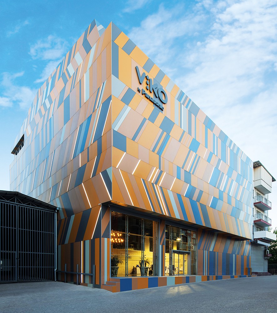 Binayı zarf gibi çeviren ve Panasonic, Osram ve General Electric’e ait kurumsal renklerle tanımlanan kaplama panelleri, mavi-turuncu-gri arasında geçiş yaparak hem bina sınırları hem de kendi tanımlı bölgeleriyle ilgili “yeni” ilişkiler yaratmış ve “olası” ilişkileri çağırır hale geldi.