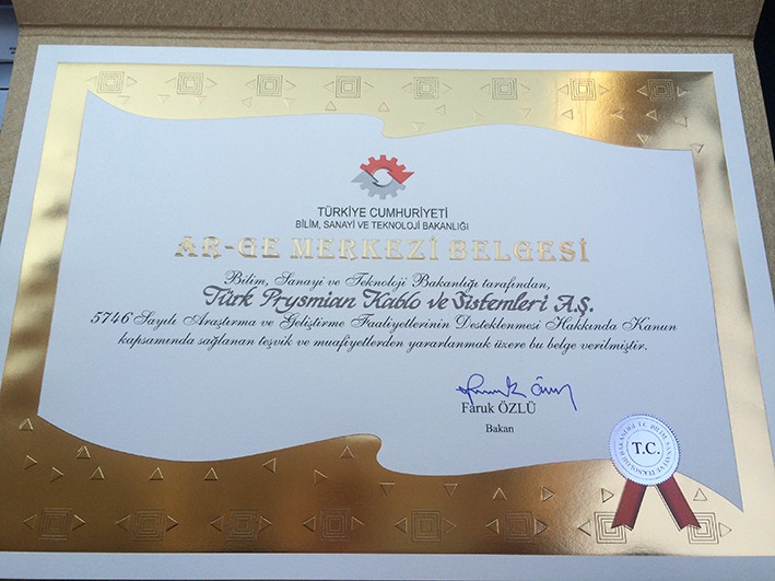 Prysmian Group Türkiye, T.C. Bilim, Sanayi ve Teknoloji Bakanlığı tarafından düzenlenen 5. Özel Sektör Ar-Ge Merkezleri Zirvesi’nde, Türk kablo sektöründeki ilk ve tescilli Ar-Ge merkezi ile bu alandaki kapsamlı çalışmaları ve yatırımlarıyla “Ar-Ge Merkezi Belgesi”ni aldı.