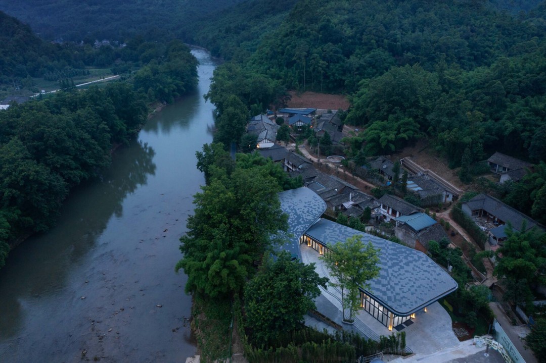 Bina nehirler, köprüler ve köyler arasında yer alır. Peyzaj fonunda iki çatı göze çarpıyor, biri köyün girişine bakan, dünyanın dört bir yanından gelen misafirleri ağırlıyor, diğeri ise başka bir yolculuğun başlangıcı olan bambu korusuna bakıyor. Birbirine kenetlenen bu iki çatı, gerektiğinde kolaylıkla bir açık hava sergi alanına dönüştürülebilecek bir kamusal avlu yarattı. Ancak, sergi gerçekleşmeden önce yerel halk tarafından bir dans pisti olarak işgal edilmiş.