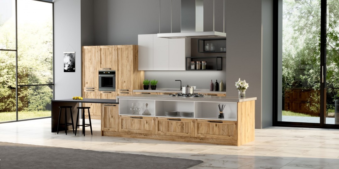 Ahşabın en doğal halinden ilham alan antik çam rengi özel dokulu çerçeveli kapakların, siyah dökme demir aksesuar ve kulplarla bir arada kullanılması, doğadaki karışık dokuların buluşmasını yansıtmaktadır. Mutfağınıza dinginlik katan düz hatlar ve sade tasarım içerisinde gizlenmiş kiler dolapları ve fonksiyonel mekanizmalar daha çok malzemeyi daha az yer ile saklamanıza imkan tanır.