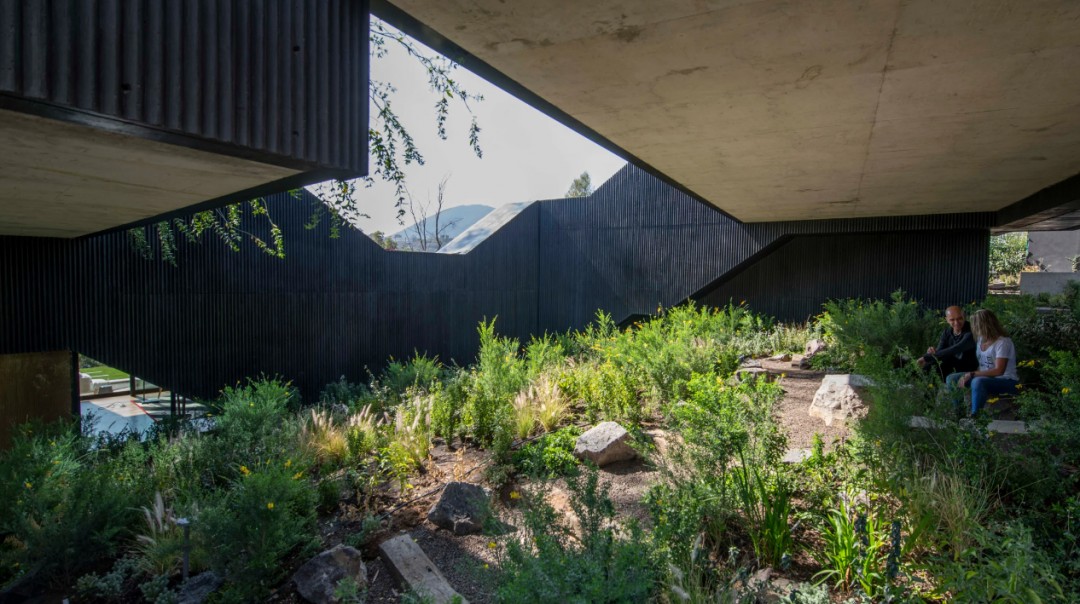 Aslında düzenleme, zemin kat ile zemin kat yaşam alanlarını birbirine bağlayan bir dizi köprü gibidir. Pereira ayrıca yükseltilmiş yürüme yolunun büyük bir kısmının arazinin eğimine uygun hale getirildiğine dikkat çekti. Etki, malzeme seçimi ile vurgulanır. Yaşam alanı camlı açık plandır, ancak yürüyüş yolları bol miktarda yivli siyah betonla kaplanmış.Tavan pencereleri ışığın yapıya yukarıdan girmesine izin vererek içeride daha dinamik aydınlatma koşullarına izin verir ve üç merdiven onu bahçe seviyesine bağlıyor.