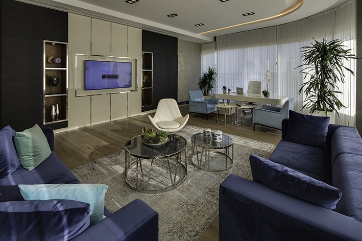 Tasarımıyla ofis çalışanlarını ve müşterileri şiirsel bir bütünlükte bir araya getiren Yedi Mavi Satış Ofisi’nin bekleme alanlarında ise yine mavinin yedi tonunun hakim olduğu mobilya ve aksesuarlar kullanılarak bütüncül ve sofistike bir tasarım elde edilmiş. Şeffaflık ve mahremiyet kavramlarını dengeleyen bir tasarım anlayışıyla çalışılan satış alanları ise cam bölücülerle ana mekandan ayrılmış.