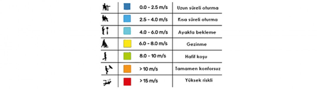 Şekil1’de rüzgârın farklı şiddetlerinde nasıl hissedeceğimiz betimlenmiştir. Örneğin bir balkonda, terasta ya da herhangi açık bir yapı mahallinde sakin bir akşam yemeği yiyecekseniz, rüzgâr hızının yaklaşık 2m/s (7km/saat) üzerinde olmaması gerekir. Yoksa masadaki peçeteler uçuşup, sinir bozucu hale gelebilir. Bununla birlikte, binadan çıkıp yakındaki bir binaya geçiş için kısa bir yürüyüş yapacaksanız 7m/s (25km/saat) rüzgâr hızı sizin için yorucu olacaktır. Yolda yürümek, elinizdeki kahvenin dökülmesi ya da arkadaşınızın ne söylediğini kesinlikle anlamamanız rüzgâra bağlı bir konfor kaybıdır. Daha kötüsü de şiddet 10m/s (36km/saat) üstünde bir mertebeye erişirse ortam artık tamamen konforsuzdur.