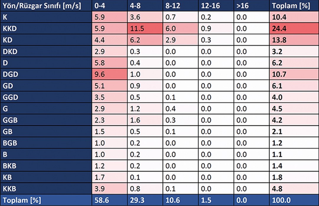 Şekil2’de örnek bir proje alanı için hâkim rüzgâr yönlerinin ve şiddetinin yüzdesel dağılımı gösterilmiştir. Tüm hesaplamalar bu verilerin referans alınmasıyla başlamaktadır.