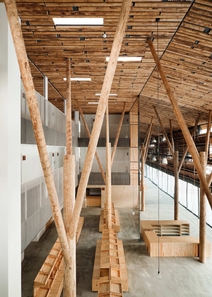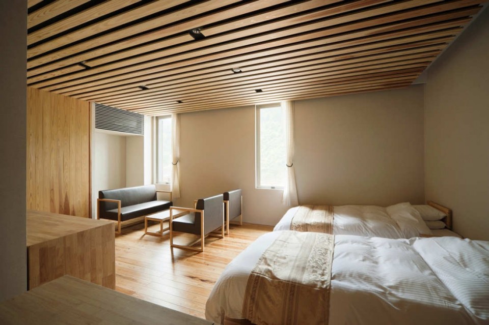 Bu perde benzeri görülmemiş bir mimari form oluştururken aynı zamanda camların yağmur suyuna maruz kalmamalarına da yardımcı olmakta. İç kısımlarda ise çimen ve sedir ağacı kütüğü gibi kaba dokulu malzemeler kullanarak Yusuhara'nın yeni özellikleri yaratılmaya çalışılmış.