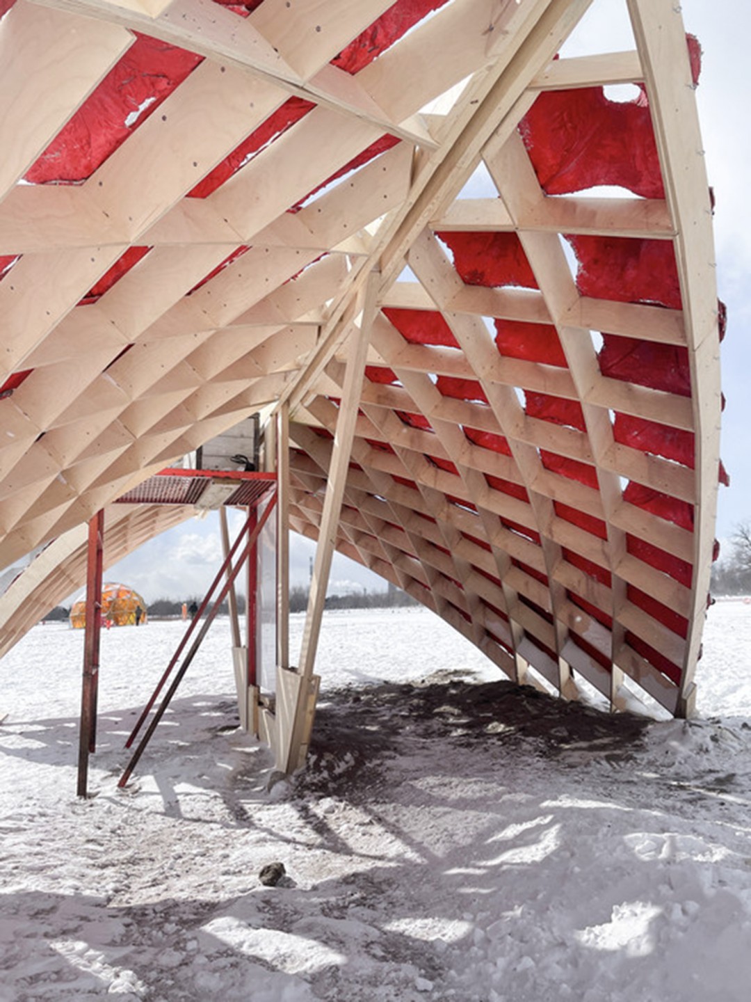 “Doğanın güçleri acımasızdır. Gökyüzünün yağan karı ve kumsalın değişen kumları gibi, pavyon da yerel rüzgâr, kar ve güneş koşullarını kucaklıyor. Belirlenen bu kuvvet yönlerine uygun olarak, pavyonun kanatları kardan yararlanarak ve kuvvetli rüzgarları azaltarak hareketi somutlaştırıyor. Plaj havluları, değişken açıklıklara sahip dinamik beton paneller halinde oluşturulmuştur. Bu paneller, içeri girmesine izin verilen ışık ve kar miktarını kontrol ederken, aynı zamanda dışarı doğru benzersiz görünümler yaratır. Paneller ve kanatlar birlikte kullanıcıları korur ve çevreleriyle etkileşim kurmaya teşvik eder. Cankurtaran istasyonu, plaj havlusu ve deniz iplerinin yazın daha sık kullanıldığı yerlerde, pavyon kış aylarında bu nesneleri kullanarak esneklik sağlıyor.