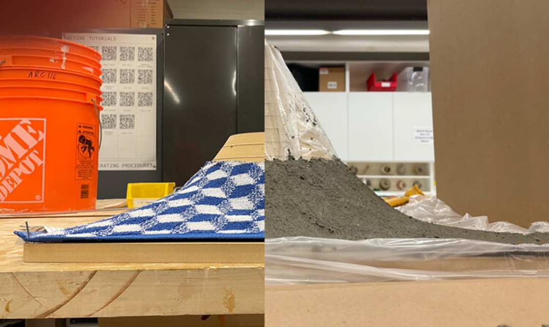 Yapı 270 CNC'den oluşmaktadır (Bilgisayar Sayısal Kontrol) baltık huş kontrplaktan yapılmış, modüller üzerine monte edilmiş ve yapıyı dikmek için kaldırılmış, mevcut cankurtaran istasyonuna takılan kesilmiş parçalar. Bu modülleri doldurmak için, bir çocuk kampında geliştirilen ve çocukların betonla kaplı plaj havlularından saksılar oluşturduğu bir aktiviteden ilham alınarak tekstil beton parçaları kullanıldı. Projenin lideri Ariel Weiss, “Tasarım ekibi saksılar oluşturmak yerine duyarlı ve heykelsi bir kaplama yaratmayı seçti. Dört benzersiz açıklık koşulu kullanılarak, konik bir kalıbın kesit parçaları bir CNC yönlendiricide MDF'den kesildi ve havluların şekillenmesi için büyük kalıplar halinde birleştirildi. Konik kalıpları ürettikten sonra, plaj havluları dört benzersiz açıklık boyutuna göre düzenlendi ve her bir havlu tipinin merkezinde farklı dairesel delikler açıldı. Bu havlular daha sonra suyla nemlendirildi ve bir beton kum karışımı ile doyuruldu. Doyduktan sonra havlular kalıpların üzerine yerleştirildi ve iki gün kurumaya bırakıldı. Kurutma işlemi boyunca, daha güçlü bir kürlenme sağlamak için beton havlular kaplandı ve sürekli su ile püskürtüldü. Dört benzersiz açıklık koşuluyla toplam 150 panel oluşturuldu, kataloglandı, istiflendi ve kurulum için sahaya gönderildi.” diyor.