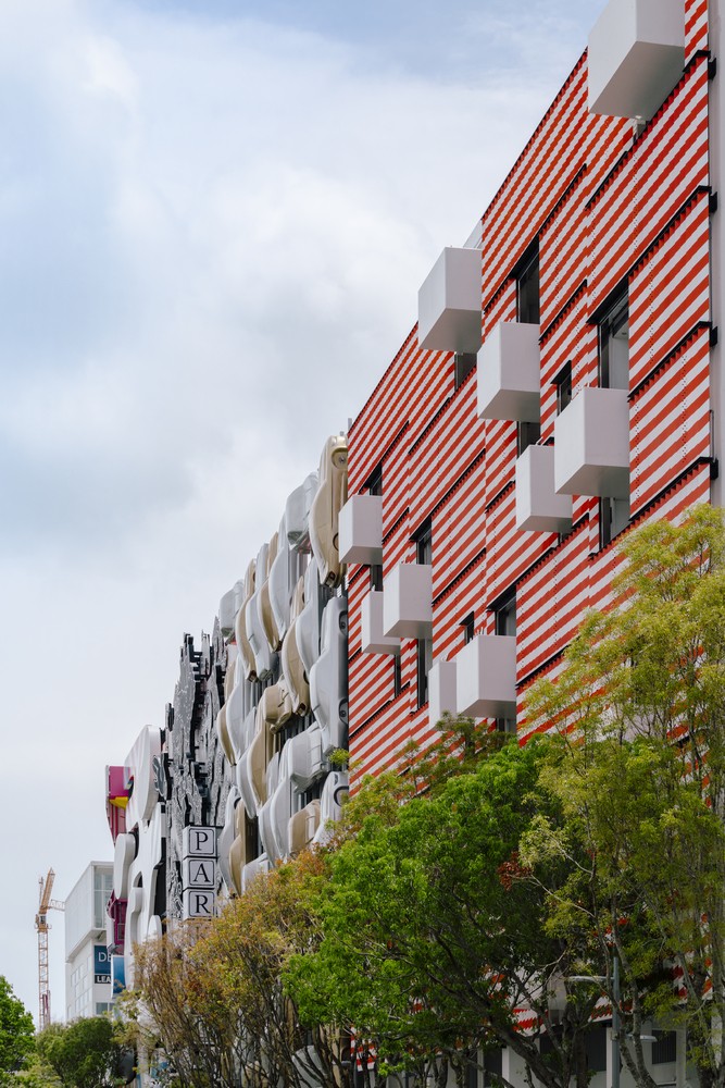 Projenin beşinci ve son parçası ise K/R tarafından tasarlanan Barricades. Yapının batı kısmında yer alan eser Miami’nin otomotiv endüstrisinden ilham alıyor. Cephe, kırmızı ve beyaz trafik bariyerlerinin dikey olarak yan yana yerleştirilmesiyle oluşturulmuş.
