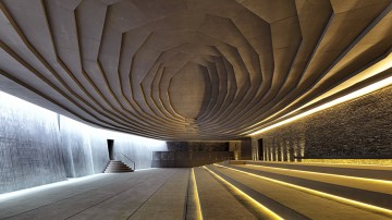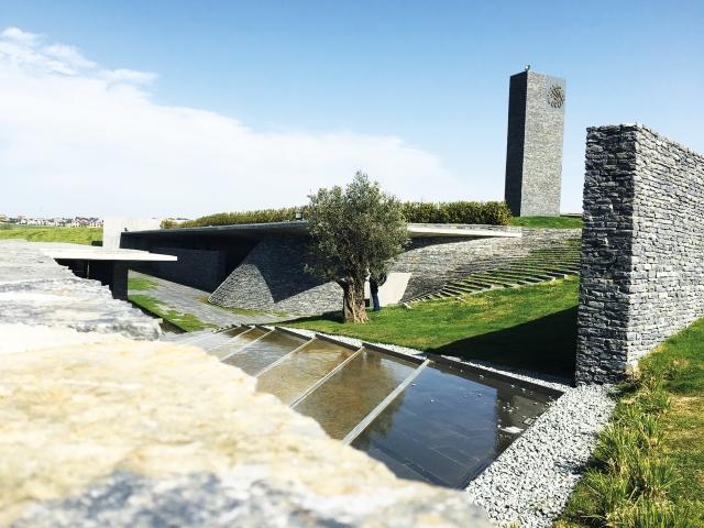 Sürekli olarak doğal olan ile insan üretimi arasındaki gerilimden ivmelenen projede, arazinin doğal eğimini takip eden doğal taş merdivenler ile 6 metre yükseklikte uzanarak saçağı oluşturan ince betonarme tavan arasındaki zıtlık, bu ikili ilişkiyi güçlendiren unsurlardan biri olarak öne çıkıyor.