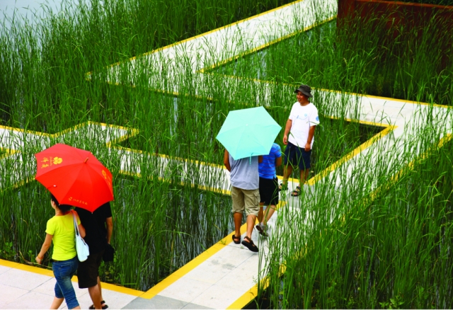 Projede yenilenen peyzaj alanı kendi içinde birden çok katmanı birleştirmeye yönelik olması hedeflenerek, alanın geçmişini günümüzün ekolojik değerlerine uyarlayarak tasarlanması amaçlandı. Çin’in tarım alanlarından esinlenilerek yaratılan teraslar, su kenarıyla yol arasında 3 ile 5 metre aralığında değişen kot farkını kademelendirerek sulak arazideki dereye bağlanan suyun akışını kontrol ediyor. Bu teraslar Şangay’da 20. yüzyıl ortalarında gerçekleşen endüstriyel gelişim öncesinden kalan tarımsal mirası hatırlatıyor. Ekinler ve bataklık bitkileriyle yaratılan kent çiftlikleri de projeye eklenerek ziyaretçilerin mevsimsel değişimleri gözlemleyebilecekleri bir tasarım yaratıldı. Böylece baharda yeni filizlenen çiçekler, yazın ayçiçekler, kışın yemyeşil yoncalar görülebilecek, sonbaharda hasat edilmiş pirincin kokusu ise şehir içinde bile hissedilebilecek. Çiftlikler aynı zamanda ziyaretçilere tarım ve çiftçilik konularında bilgilenme fırsatı da sunuyor. Sulak alanların etrafındaki teraslar insanların sisteme dâhil olabilecekleri alanlar yaratarak genel peyzajı zenginleştiriyor. Arazinin koridorlarından bu alanlara ulaşan insanlar ilk olarak tarımsal peyzajı ve sulak alanı görebiliyor. Yollardan kurulu ağ, aynı bir süngerin yapısındaki boşluklar gibi insanları içine çekip bırakarak parkın içindeki sirkülâsyonu sağlıyor.
