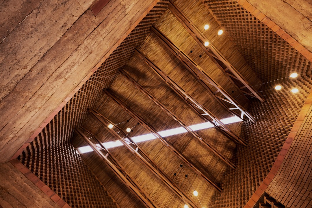 Tasarımda kullanılan malzemeler Kampala'nın havasından izler taşıyor, kum taşı yapının temelini oluştururken, sıkıştırılmış toprak ve dokulu tuğla bunun üzerinde yer alıyor ve yelken çatıları destekliyor. Yerel kaynaklı okaliptüs ahşabı, sıkıştırılmış toprak kalıp için kullanılmış ve daha sonra çatı kaplamaları yapmak için yeniden kullanılmış.