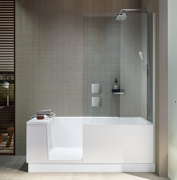 Kesin hatlar, Shower + Bath tasarım dili karakteristiğini yansıtmaktadır. Dikdörtgen temel form ile kademeli eğimli kenarlar, duş alırken geniş hareket alanı sağlar. Duşun etrafında, opsiyonel aynalı cam olarak seçilebilecek, geniş bir cam muhafaza bulunur. Bu versiyonda, küçük banyolara görsel bir genişlik sağlayan ilave bir parça sunulmaktadır. Ayı zamanda, bütün küvet boyunca hareket ettirilebileceğinden dolayı, duş alırken minderin üzerine oturabilirsiniz.