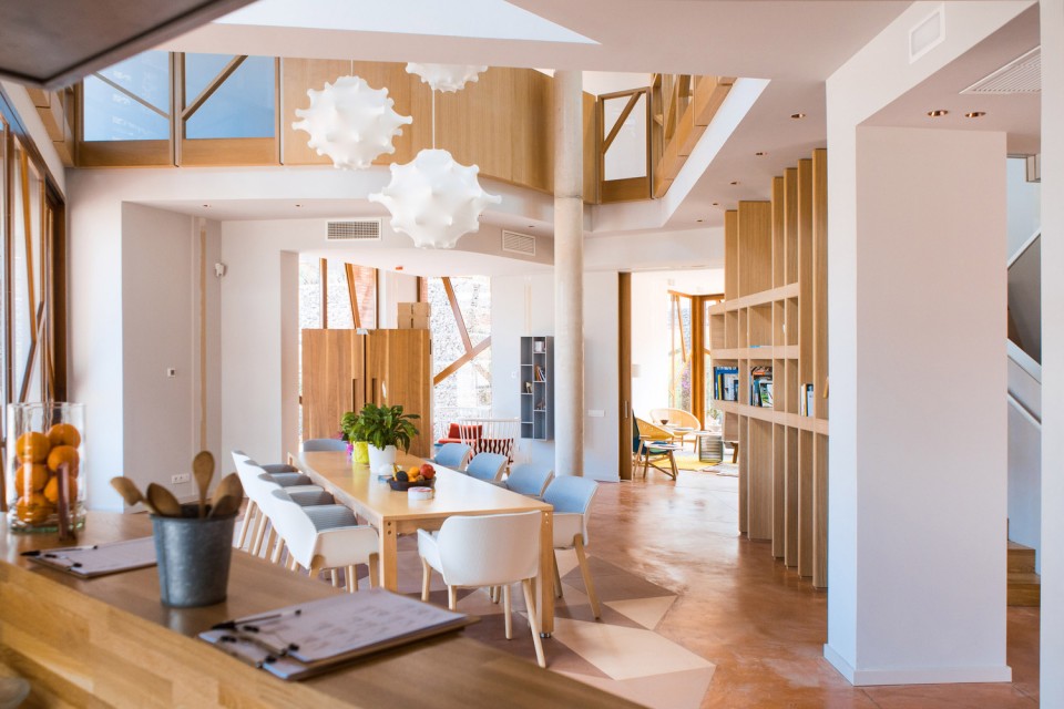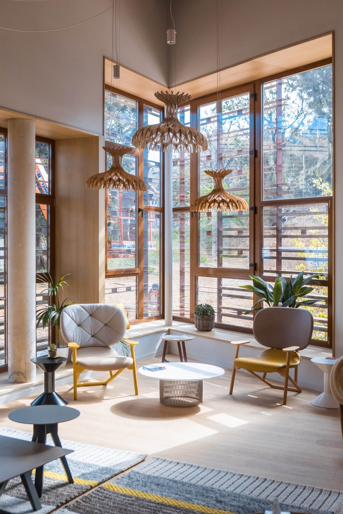 Mimarlar tarafından sağlanan metin açıklaması. Kálida Center, kanser hastaları ve etrafındaki insanlar için duygusal, sosyal ve pratik destek alanı sağlayan, nitelikli profesyonellerin yardımlarını sunduğu, etkileşim kuran herkese açık bir kamusal evdir.