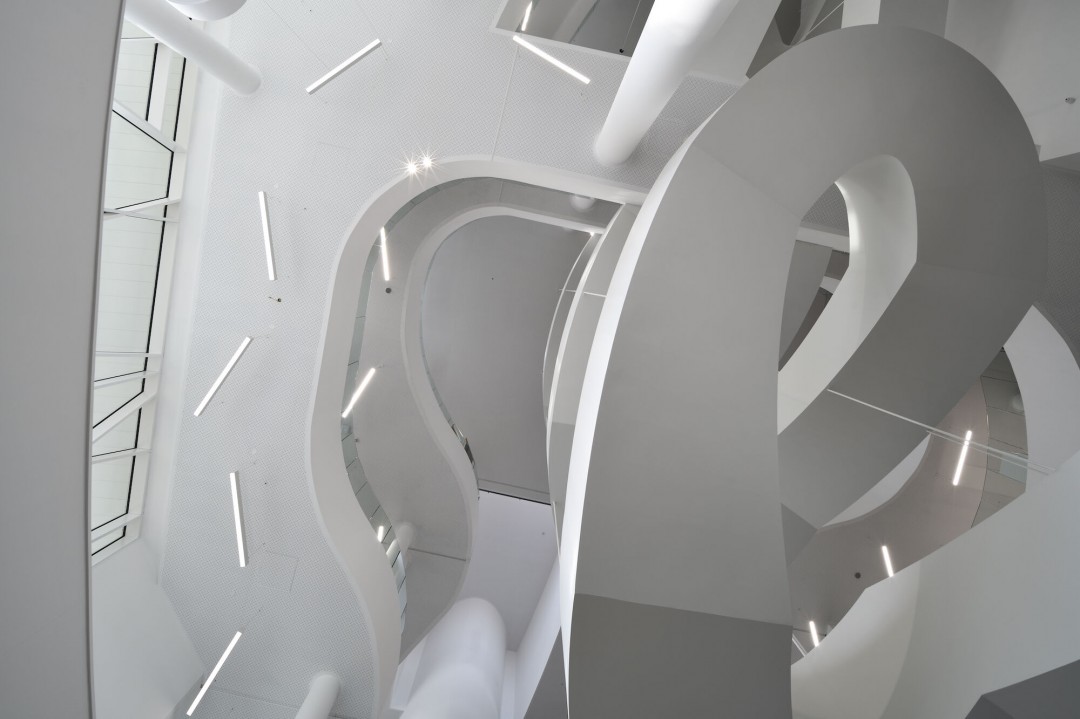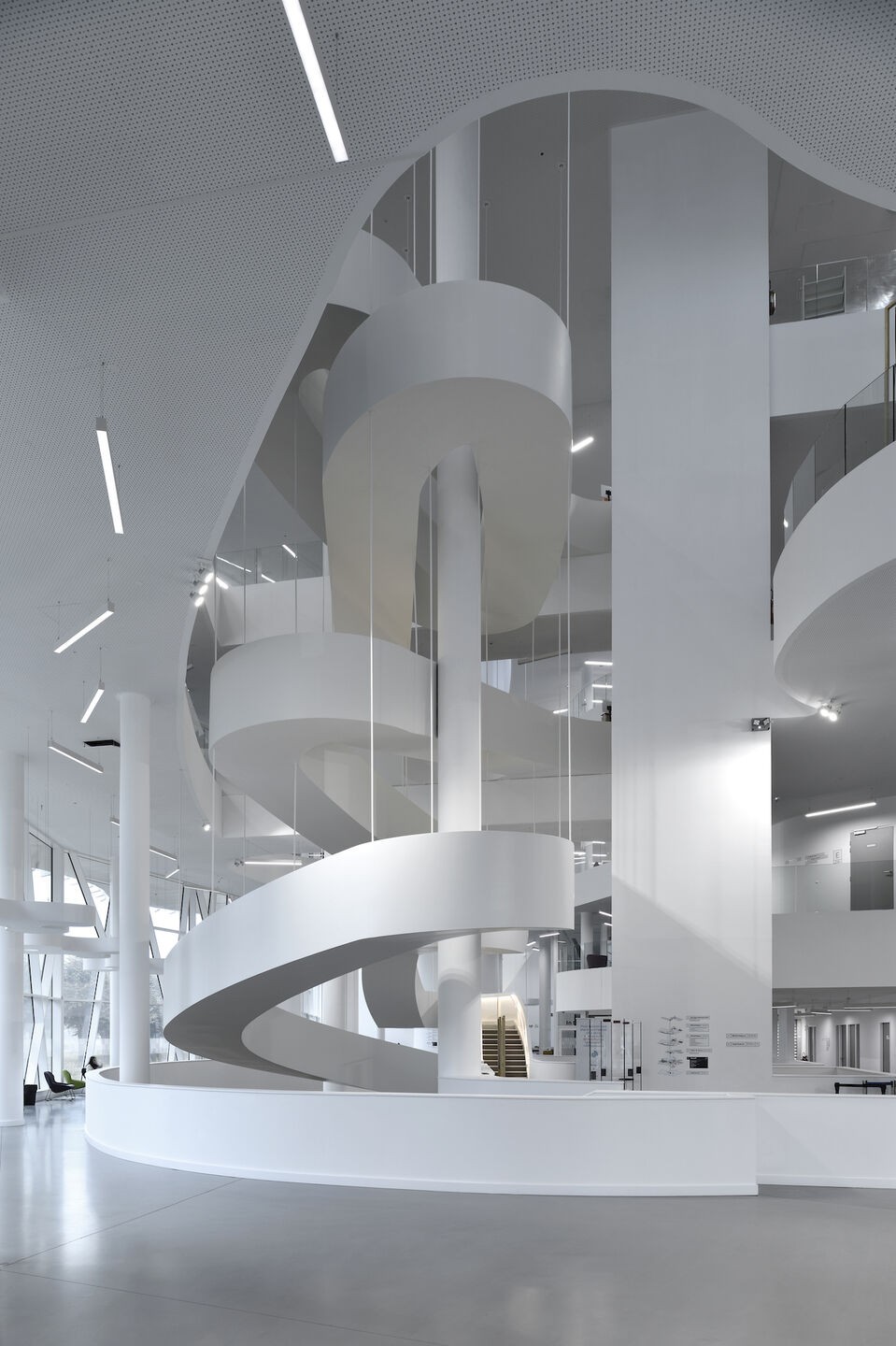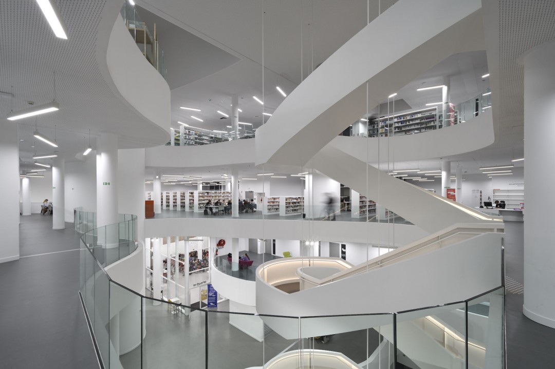 İçeride şeffaf bir platform zemin katın, lobinin, öğrenci birliğinin ve kafeteryanın kamusal alanlarına bakarken, üst katlar koleksiyon yığınlarına ve okuma odalarına ayrılmış. Cephe tasarımı, ışık kontrol konseptlerinden kaynaklanmış. Destekli zemin güneş ışığını engellerken, büyük güneşlik parlak tabanları, camlı bölmeleri korur ve doğal ışığı filtreler. Bu unsurların konumu ve yönelimi, gerekli miktarda doğal ışığı ve şehir manzarasını garanti eden sıkı güneş yolu analizine dayanır.