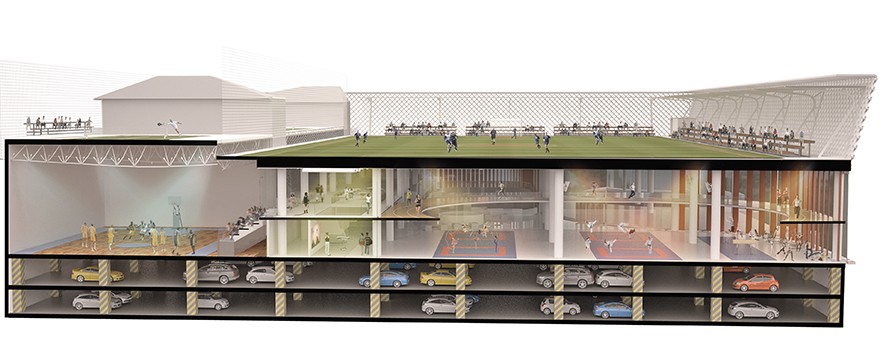 Proje alanında yer alan ve tasarımın önemli girdilerinden biri olarak ele alınan mevcut futbol sahası yükseltilerek, altına farklı spor aktivitelerine yönelik hacimler yerleştirilmiş. Böylece hem eski doku korunmuş, hem de “maksimum spor alanı” talebinin karşılanması sağlanmış. Yapının cephe kimliği de yukarı taşınan futbol sahasıyla oluşturulmuş. En üst katta yer alan futbol sahası, aynı zamanda tüm kompleksin çatı örtüsü işlevini üstlenmiş. Açık sahayı çevreleyen şeffaf örgü, dış yüzeyde yer yer alt kotlara inerek cephenin ana karakterini tanımlamış. Bu sayede altında yer alan meydanı da daha vurgulu hale getirmiş. Projenin kimliğini oluşturan kabuk, zemin katta kopartılarak vurgusu artırılmış. Spor ile iç içe olan bir yapıda hem fiziksel hem de duygusal işleve sahip bir cephe oluşturulması esası bu şekilde yerine getirilmiş.