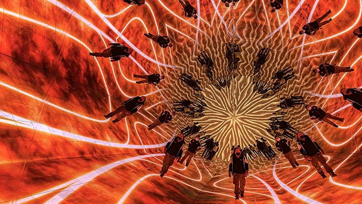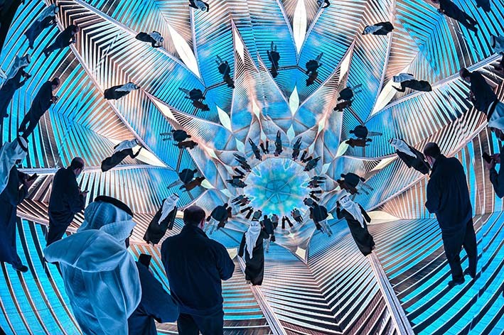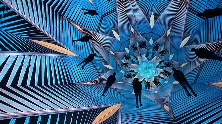 1-3 Şubat tarihleri arasında Suudi Arabistan'da kısa süre önce sona eren LEAP 2022 konferansında, Londra merkezli Stufish Entertainment Architects, etkinliğin ziyaretçilerini dünyanın en büyük kaleydoskopu şeklinde karşılamak için nefes kesici bir hipnotik deneyim sundu. “LEAPscape” başlıklı sürükleyici kurulum, ulusal başkentteki Riyadh Expo Center'ın girişine yerleştirildi ve Suudi Arabistan'ın doğal ortamından, dijital olarak değişen içerikle kaplanmış sahneleri sergiledi. Enstalasyon, ülkenin teknoloji ve inovasyon savunuculuğunu vurgulayan üçgen ve yıldız şeklindeki geometrilere dayanıyordu.