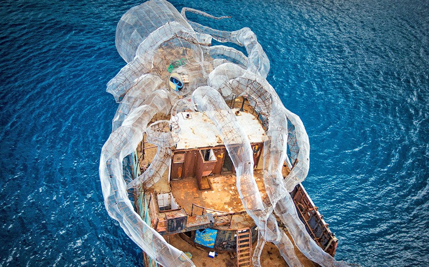 Ekoloji ile ilgili konulara dikkat çekmek isteyen bir grup sanatçı, mercanların yaşamlarını devam ettirebilecek bir doğal ortamın oluşmasını gündeme getirmek için çalışmayan bir geminin üzerine dev bir ahtapot inşa etti.