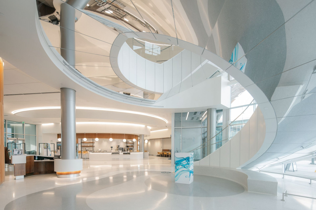 Yapı halkı bir nehir girdabının formlarından etkilenen, spiral bir merdivenle üç seviyeye bağlanan geniş bir giriş lobisine çekiyor. Bu özellikli merdivenler, bina kullanıcılarını merdivenleri aktif olarak kullanmaya teşvik etmekte ve National Western Center Grand Plaza üzerinde sergiler ve doğal manzaralar sunar.